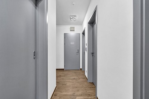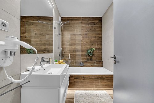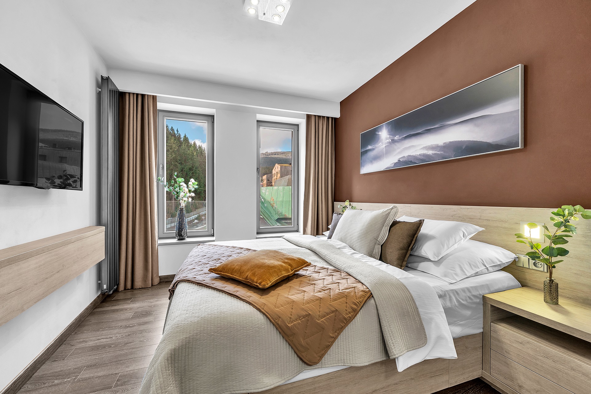 Apartmán se nachází ve 3. nadzemním podlaží, je plně vybaven a připraven k okamžitému užívání. V obývacím pokoji s kuchyňským koutem, jídelním stolem pro 4 osoby, sedací soupravou s TV je citlivě zakomponováno plnohodnotné dvoulůžko. V případě potřeby lze ještě rozložit sedací soupravu na další dvoulůžko. V ložnici je pohodlné dvoulůžko, vestavěná šatní skříň a druhý velkoplošný televizor. Z obývací místnosti je možný vstup do lodžie s výhledem do ulice. Z předsíně s vestavěnou skříní na oblečení, šatní stěnou a zrcadlem vstoupíme do koupelny s vanou, samostatného WC a komory, kterou je možno využít rovněž jako šatnu a místo pro sezónní oblečení a obuv. Praktická dispozice s dostatkem úložných prostor poskytuje pohodlný odpočinek a soukromí pro rodinu se dvěma dětmi nebo pro 4 sportovně založené dospělé parťáky (nouzově i 6 osob), kteří se neobejdou bez pobytu na horách a bez nadstandardních služeb během letní i zimní sezóny. V suterénu je k dispozici vlastní garážové stání a zděná sklepní kóje na lyže/kola a lyžařskou obuv. Všechny zámky dveří apartmánu a společných prostor jsou ovládány čipovou kartou.